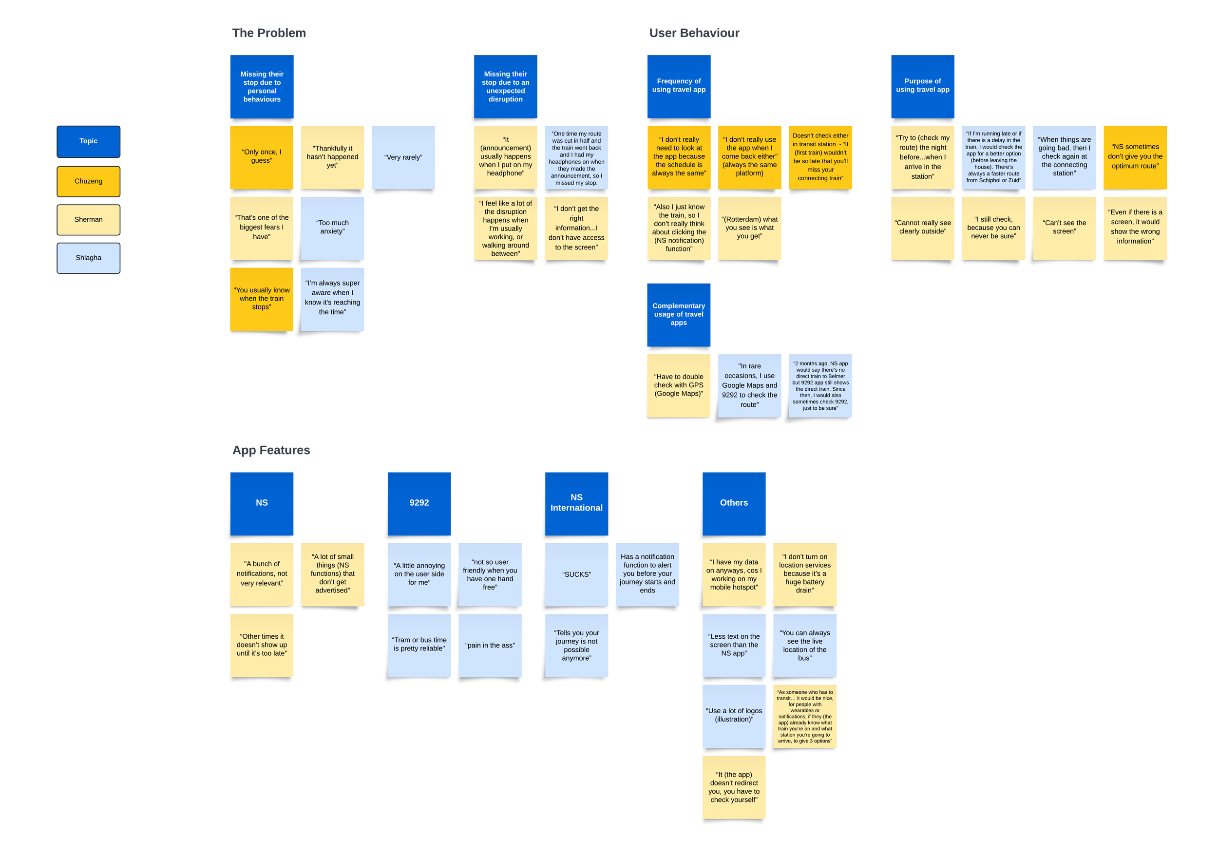 Although I now have a clearer understanding of what I’m starting with, I still need to determine whether this problem creates a significant demand for businesses and customers alike. Typically, a semi-structured interview is conducted to gain valuable insights during this stage of the research process. Users can describe — in their own words — their feelings about the problem and their experiences with existing solutions. It also enables researchers to create a comprehensive map of users’ behaviours, motivations, needs and pain points. I specified that the user is someone who uses public transport in the Netherlands on a regular basis, and conducted three user interviews with participants who fit that profile. The interview notes are then sorted according to themes, which I organised into an affinity map.