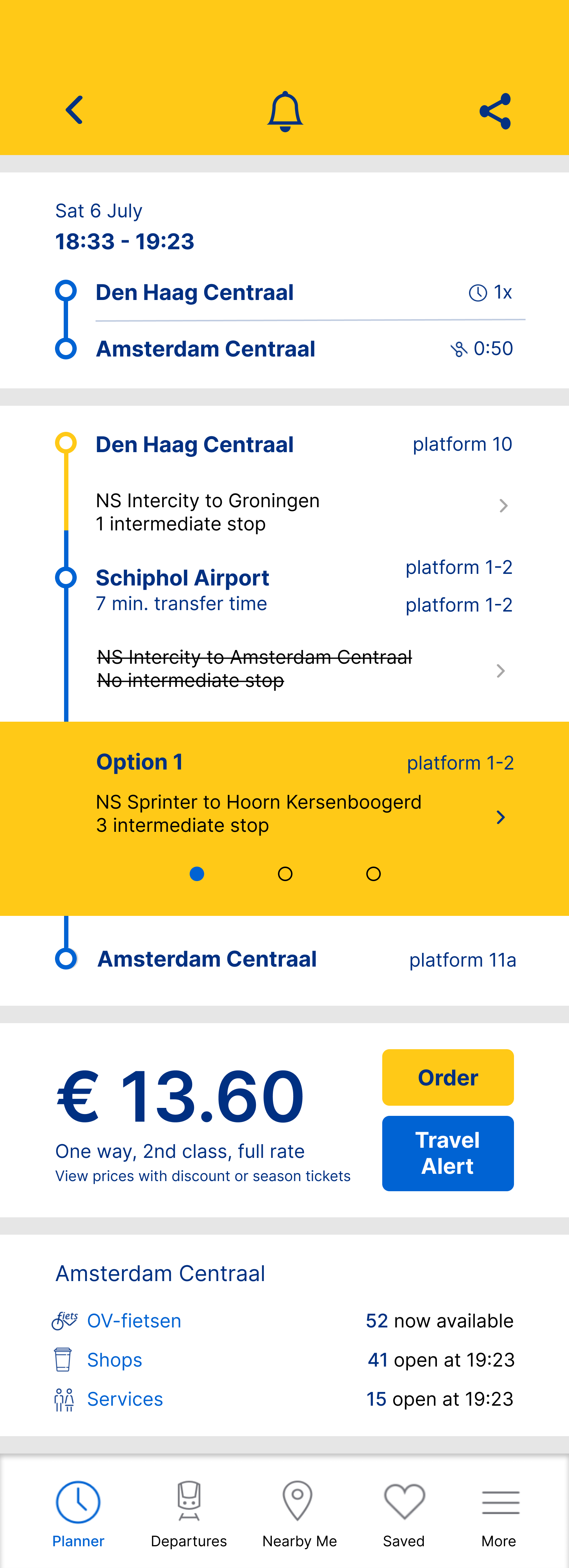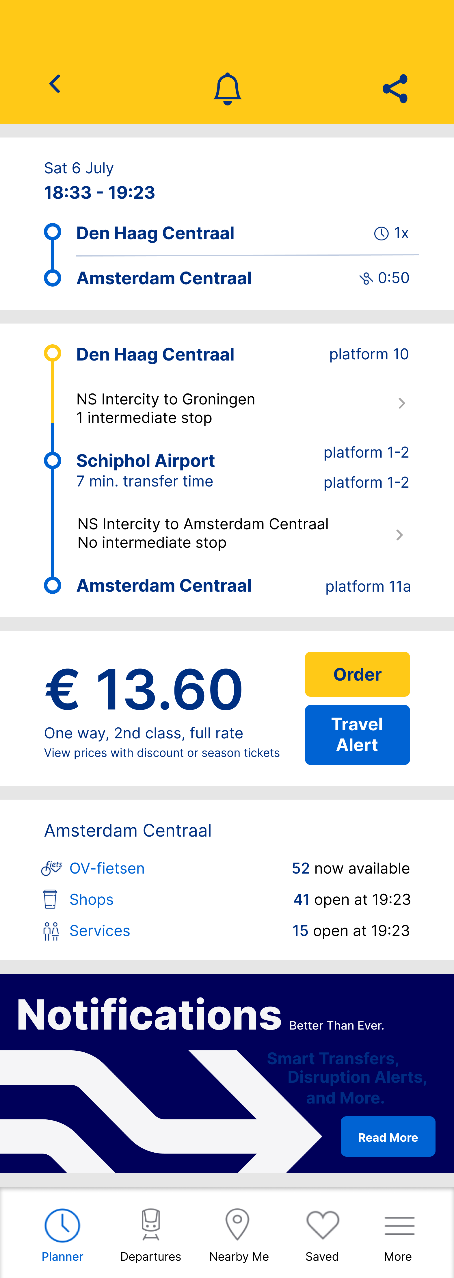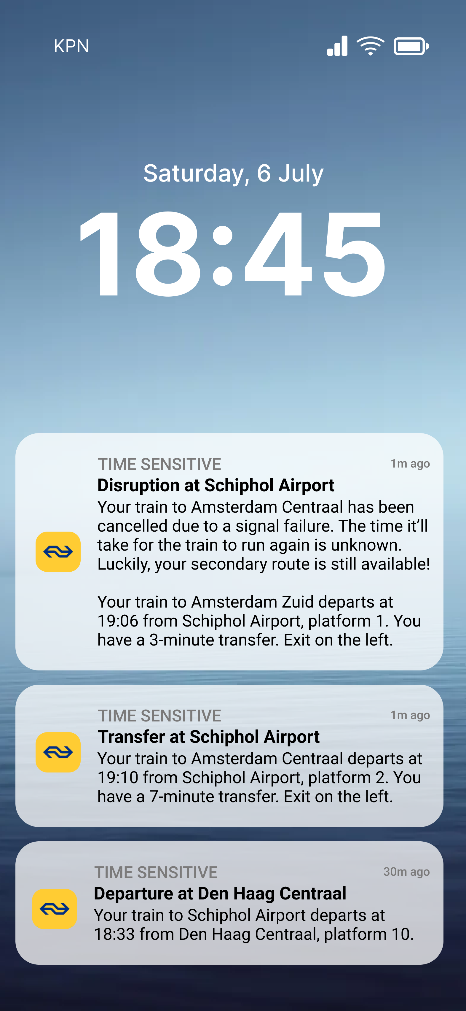 Indicate the start of the commute with a home screen notification that displays information about the first half of their journey (Den Haag Centraal to Schiphol Airport).