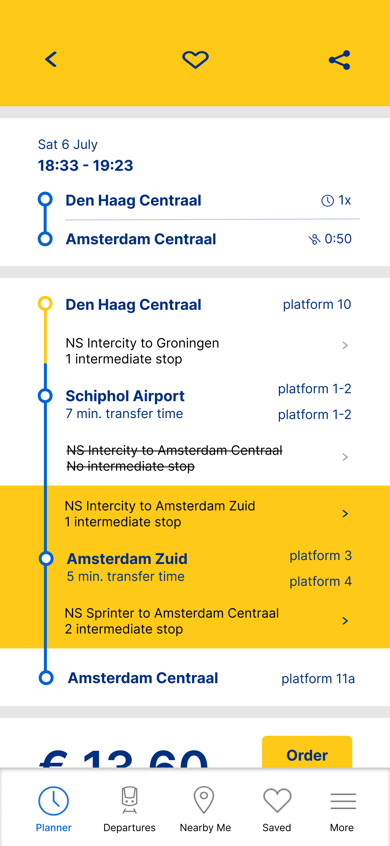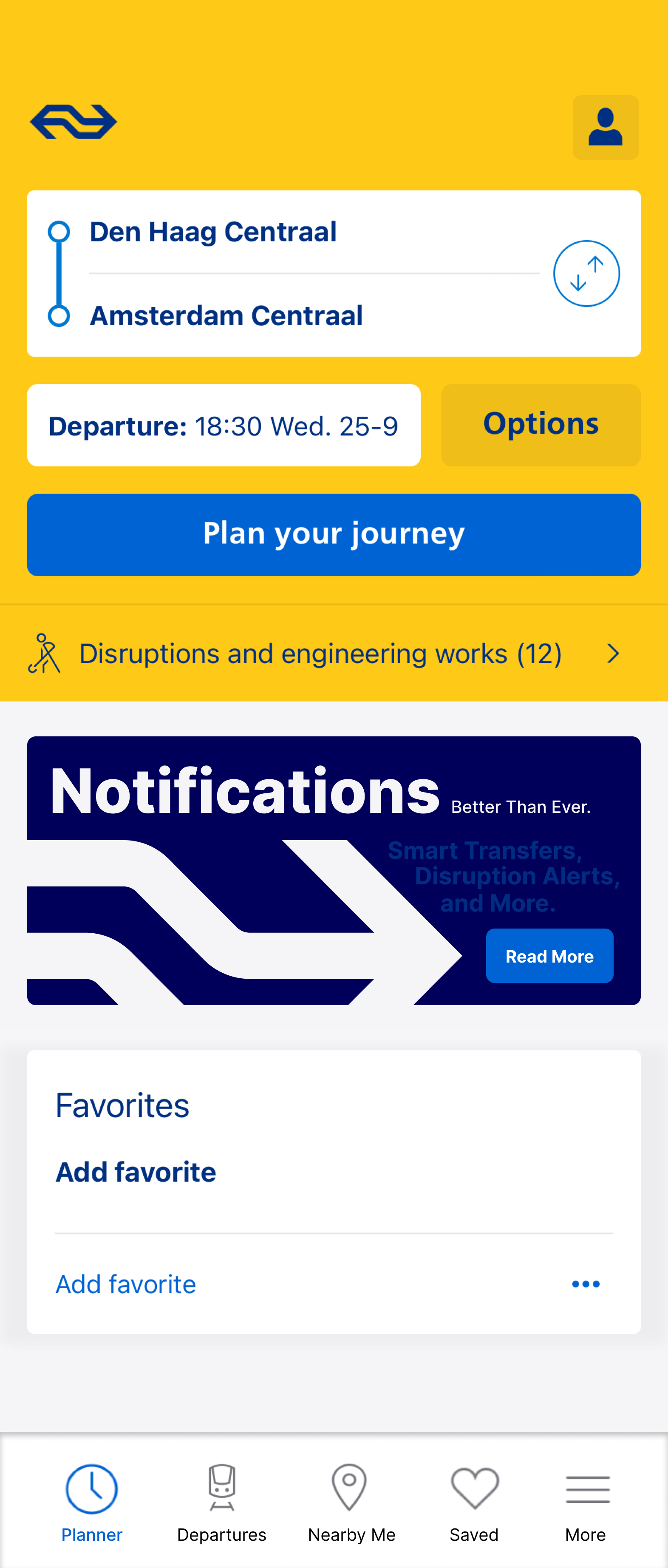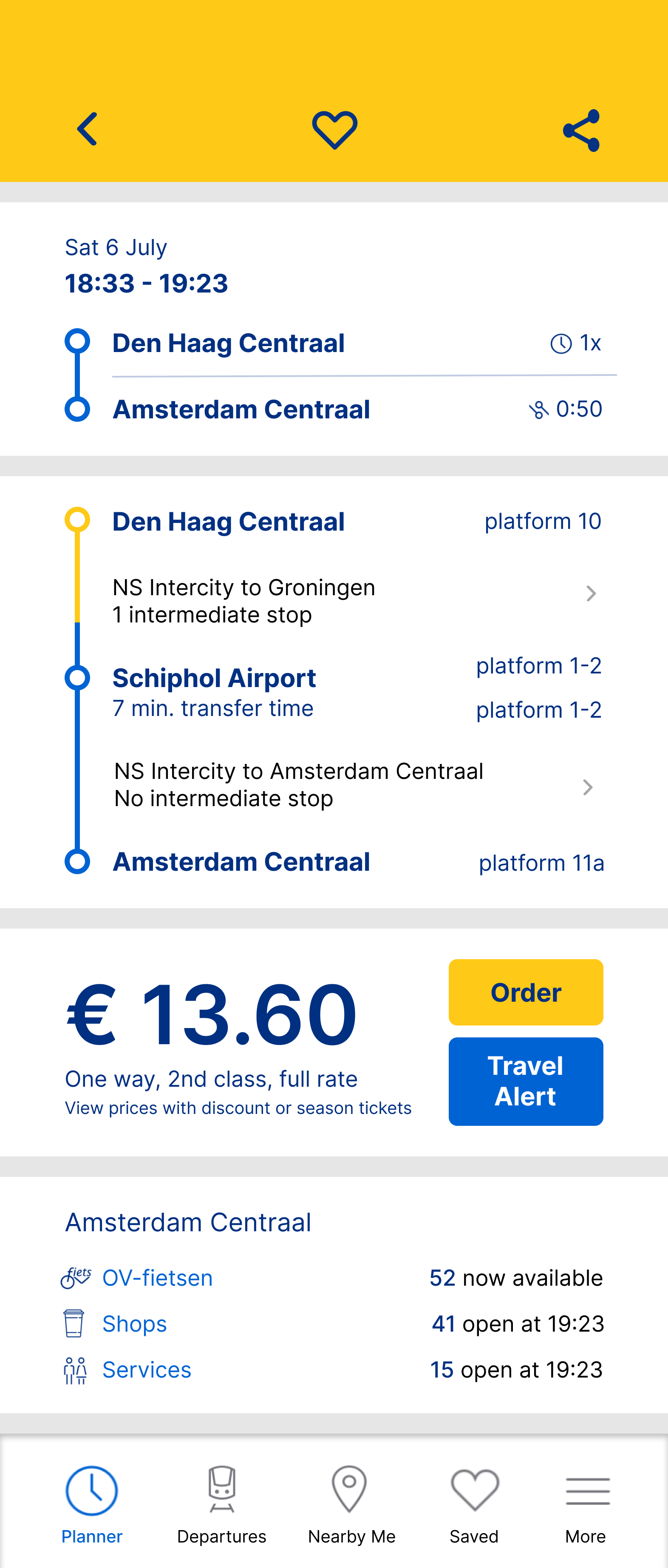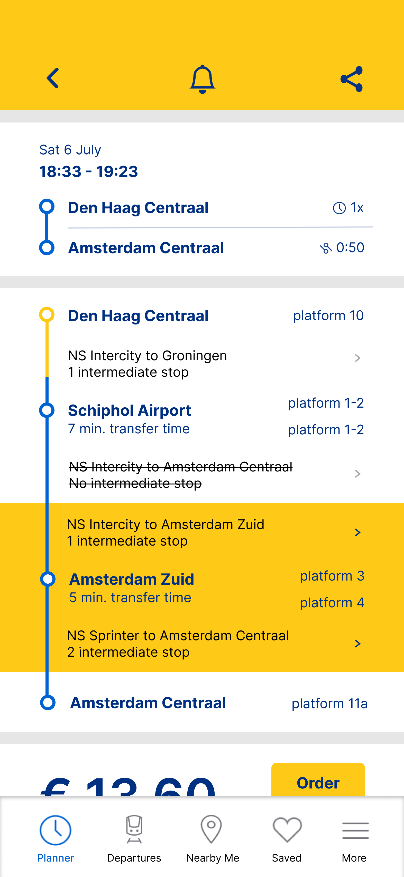 Indicate the start of the commute with a home screen notification that displays information about the first half of their journey (Den Haag Centraal to Schiphol Airport).