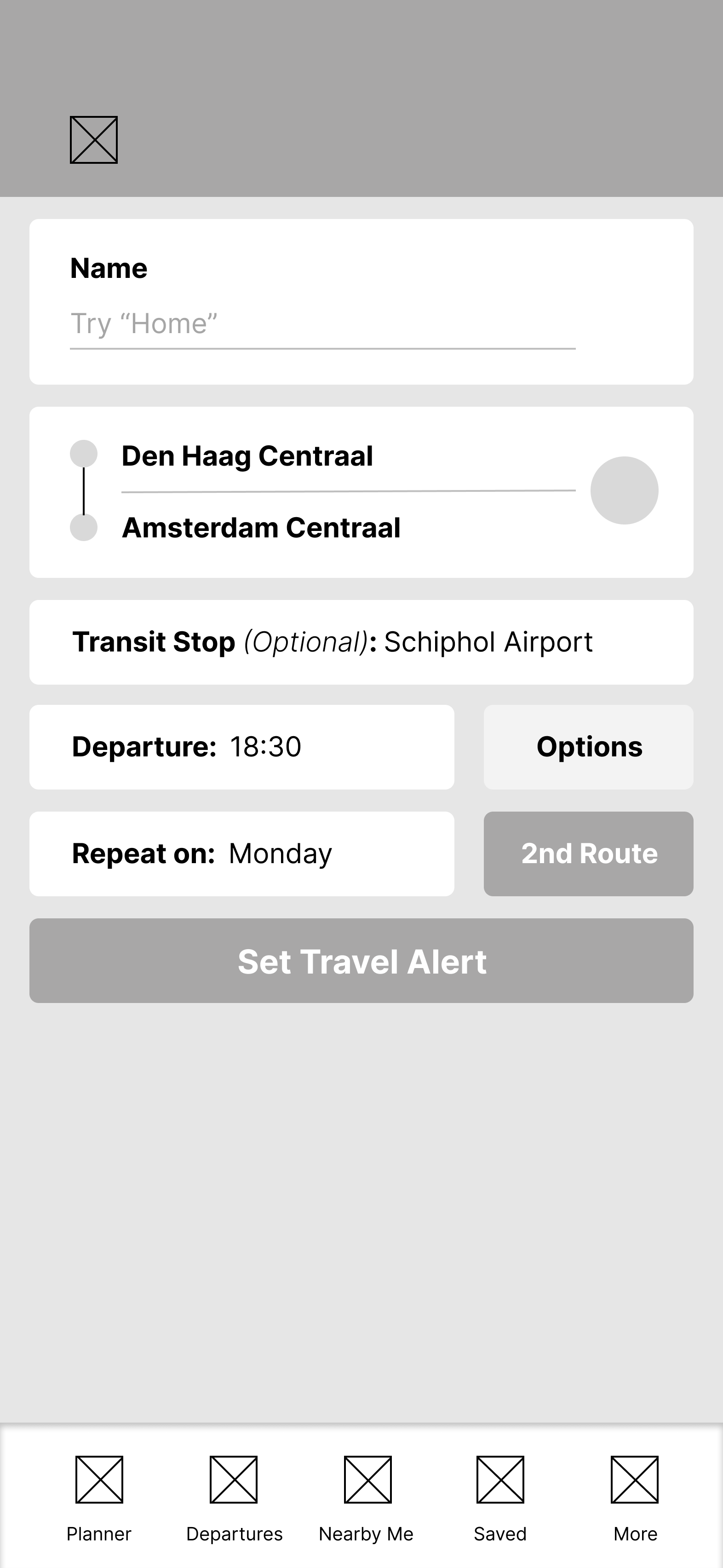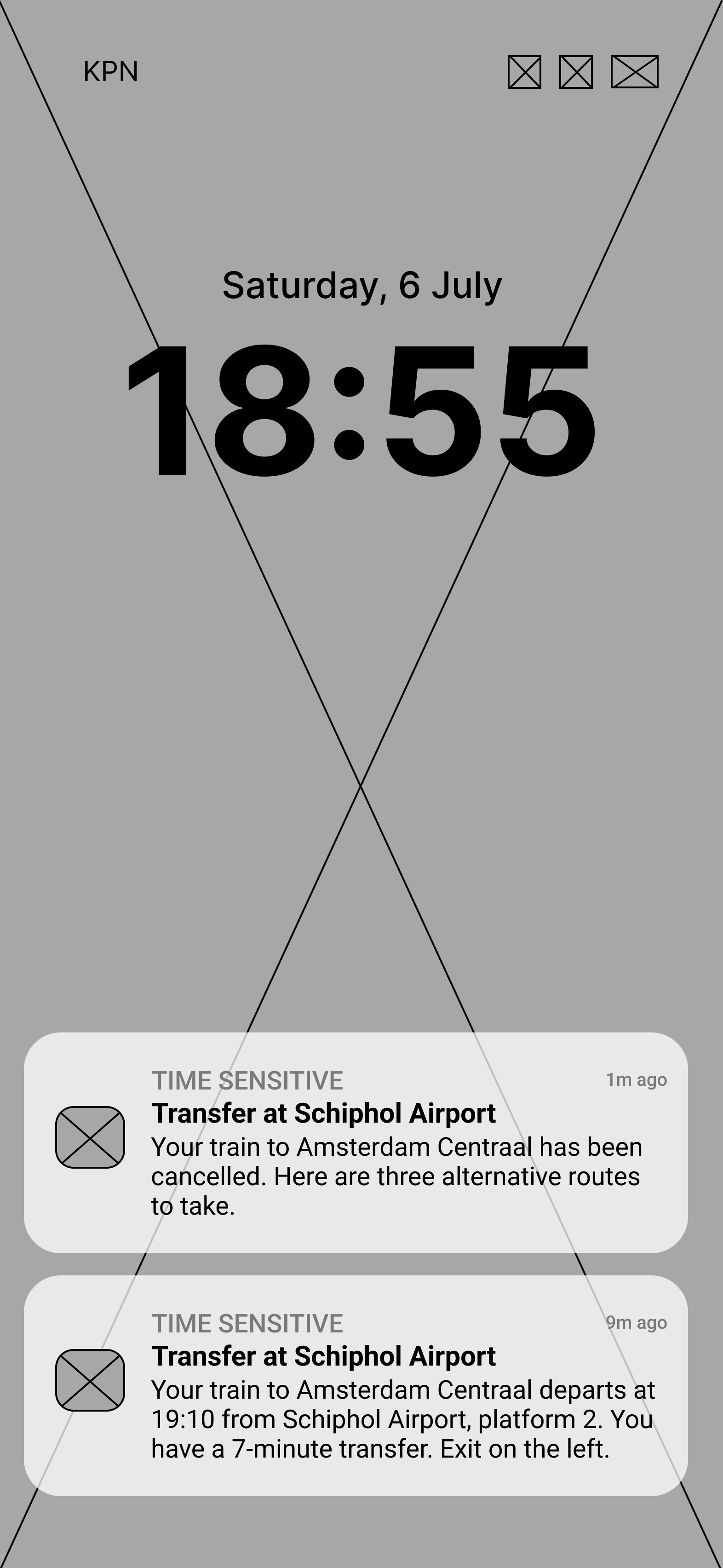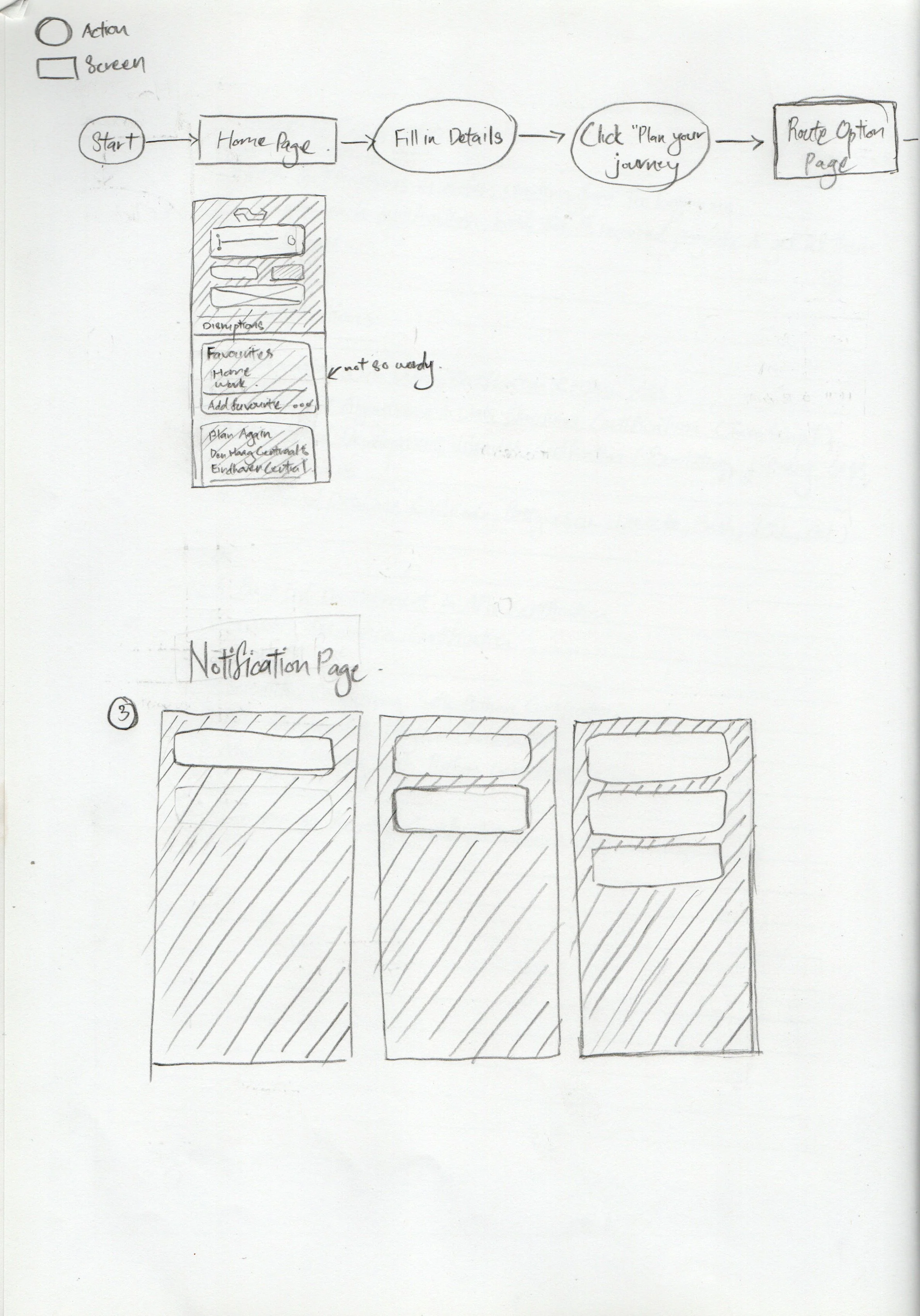 I started sketching low-fidelity wireframes of the NS “Planner” screen, the notification settings screen and the home notification screen. Taking into account the NS Travel Planner app design, I rendered out my sketches into mid-fidelity wireframes which outlines the screens’ layout with text and image placement.
