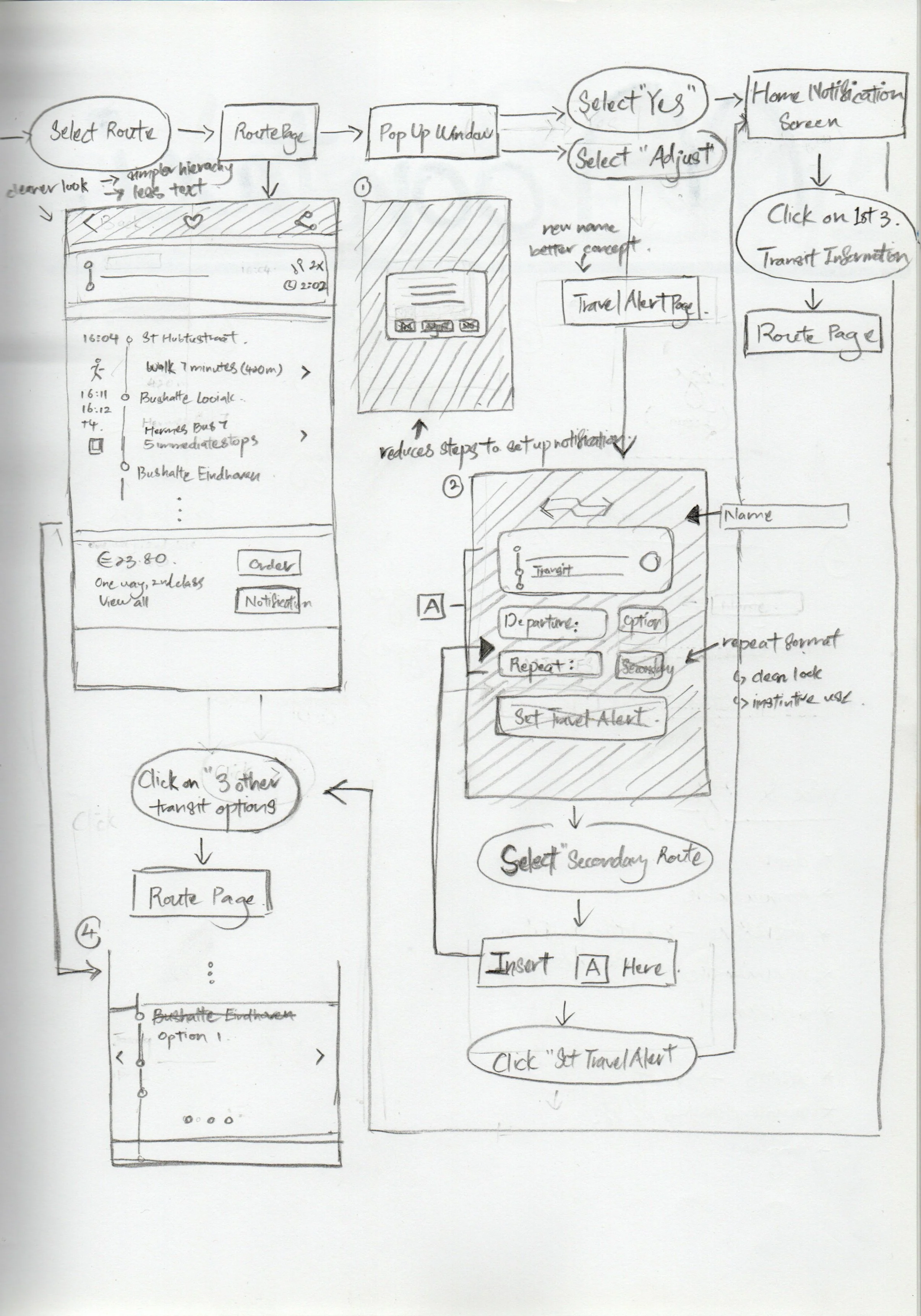 First, I mapped out a task flow that incorporates my design improvements into the steps a user would typically take while using the NS Travel Planner app. This ensures integration optimisation in the user process, and makes for a clear, systematic and research-based wireframing and prototyping process.